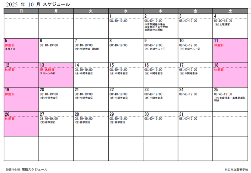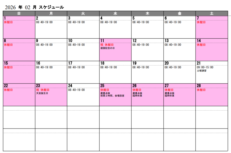 図書館開館・閉館カレンダー