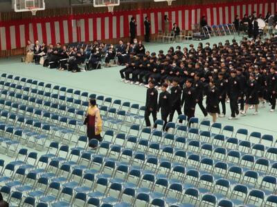 13日(金)厳粛な雰囲気の中、第8回卒業証書授与式が挙行されました。ご来賓の方が入られた後、吹奏楽部による演奏とともに1組から入場しました。