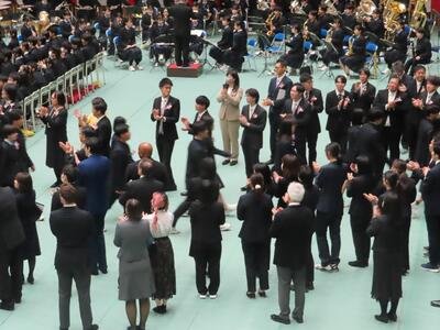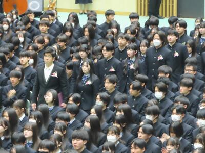 最後に卒業生合唱「旅立ちの日に」と「校歌」を歌いました。歌いながら涙する卒業生もいてとても感動的な大合唱となり、感極まっている様子が見られました。退場の際は、多くの教員に見送られながら晴れやかな門出の日となりました。