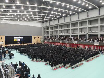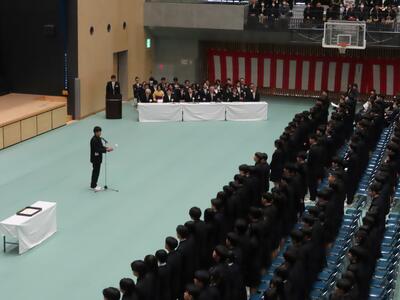 12日(木)に厳粛な雰囲気の中、卒業式予行が行われました。礼法指導から始まり、歌唱練習では大アリーナに響きわたるように大きな声で歌っていました。その後、全体の流れを確認し、皆勤賞の表彰が行われました。3年生は真剣な面持ちで所作を行い、1・2年生も3年生をしっかりと送り出そうとする姿勢が見られました。