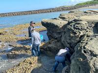 7/21日(月)、湾岸生物探究合宿二日目は潮の満ち引きの関係で朝の7時に実験室前に集まり、清本先生のアテンドの元磯採集から始まりました。