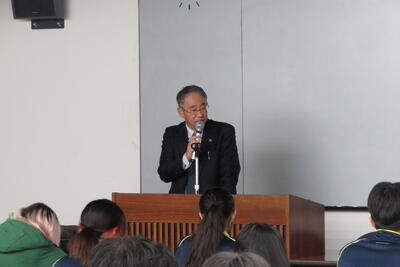 続いて行われた修了式では、校長先生より講話があり、「自分を高める方法」についてのお話がありました。個人に影響を与える要素として、環境・感情・身体・認知・行動の五つが挙げられる中で、自分の力で変えやすいものは「行動」であるという内容でした。生徒たちは、自らの行動を見直し、より良い成長につなげていく大切さについて考える機会となりました。