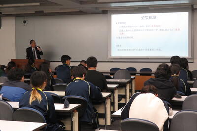 授業冒頭では過労死についてのビデオを視聴しました。過労死で家族を亡くした方からの切実な願いに生徒たちは真剣に耳を傾けていました。佐渡島先生からの講義では労働時間や休暇についてなど、働く上で知っておかないと損をする可能性があることを学びました。