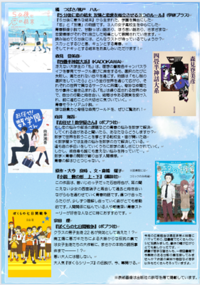 ここで紹介した本は図書館を入ってすぐ右手の『図書委員おすすめ』の棚に展示してあります。手に取って、ぜひ読んでください。