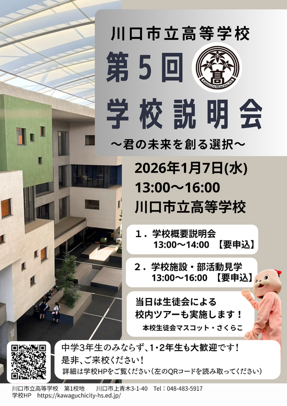 今月末には第1回学校説明会もあります。進学フェアで川口市立高校に興味を持ってくださった方は、ぜひ本校に足をお運びください!