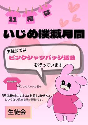 本校での取り組みとしては、強調月間の期間、いじめ撲滅を訴えるため生徒会役員・担当教員を中心に”ピンクシャツバッジ”を身につけています。