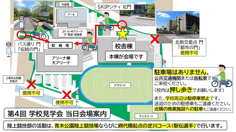 ① 駐車場はありません。公共交通機関または自転車でご来校ください。