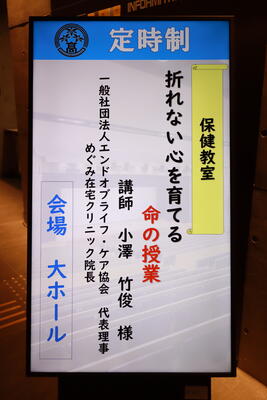 今年度は一般社団法人エンドオブライフ・ケア協会代表  小澤  竹俊  様をお招きして、「折れない心を育てる  いのちの授業」というテーマで講演をしていただきました。苦しんでいる人に対して『あなたの気持ち分かる』よ」と、つい言ってしまいがちですが、本当にその気持ちが分かるのは苦しんでいる本人だけということに気づかされた生徒が多かったようです。