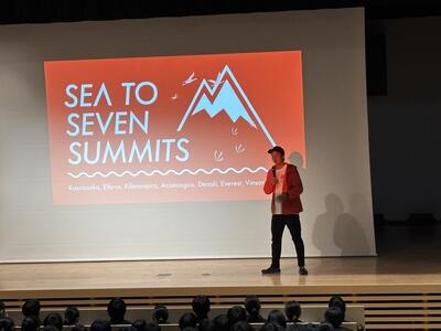 1年次では、11月6日(木)、冒険家の吉田 智輝 氏をお招きしてご講演をいただきました。演題は、「地図のない旅に出ようー川口から世界へー」です。吉田氏は7大陸すべての最高峰を海抜ゼロメートルから踏破する「Sea to Seven Summits」に挑戦されています。現在5大陸を制し、残り2大陸への挑戦に向かっています。