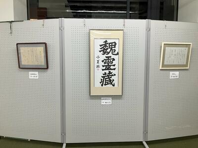 写真は展示の様子と、展示作業に協力してくれた書道部の皆さんです。