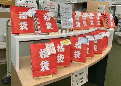 毎年恒例の図書館福袋を、図書委員が福を呼び込む飾り付けと一緒に並べてくれました。袋の中には3冊の本が入っています。何が入っているかは開けてみてのお楽しみ。それではちょっと手に取れないという人は、添えてあるカードをヒントにしてください。冬休み、いつもの自分のセレクトとは違う読書を楽しんでみませんか。20袋限定で早い者勝ちです!