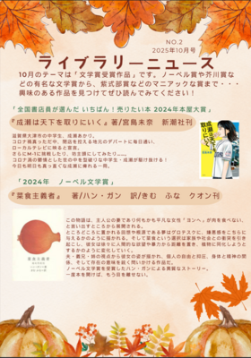 ライブラリーニュースは図書委員会広報係のメンバーが作る図書館の本についてのニュースです。今年度は毎月テーマを決めて、メンバーがそれぞれ図書館にあるおすすめの本を持ち寄って作っています。今月のテーマは《文学賞受賞作品》です。いろいろな文学賞にどんな本が選ばれているか、興味深いですね。