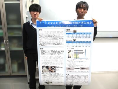 9月の研究発表では2テーマでしたが、その後自分の研究内容を見つけるなどして今回は4テーマの発表となりました。当日まで何度も内容を確認し、それぞれが頑張ってポスターを完成させました。会場では多くの大学生がそれぞれポスター発表を行っていて、その研究内容も高度で圧倒されたかと思います。その中でも、私たちの発表の際は大学生や教員の方々が声をかけてくださり、発表も見ていただけました。