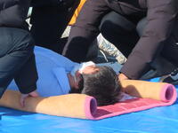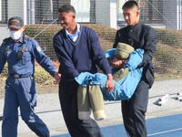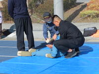 1年次は消防署の方から、傷病者の運び方を習いました。担架を用いて人を運ぶ方法だけでなく、毛布を担架代わりにして人を運ぶ方法、手元に何もないときに人間だけで傷病者を運ぶ方法を学びました。