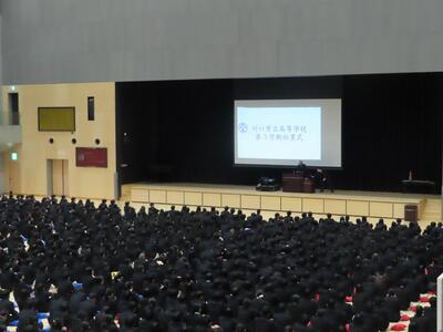 24日(水)に終業式が行われました。校長講話ではそれぞれの年次に対して話をされました。3年次に対しては、「受験勉強を乗り切った後、自分の頑張りや仲間のありがたさが、よりよい思い出に、さらに自分自身の大きな自信につながる」ということを話されました。1・2年次に対しては、「本校での学校生活を充実させ、自分のためや誰かのためになることに興味関心を抱いたら、まずはチャレンジしてほしい、高校生だからできることを大切にしてほしい」ということを話されました。