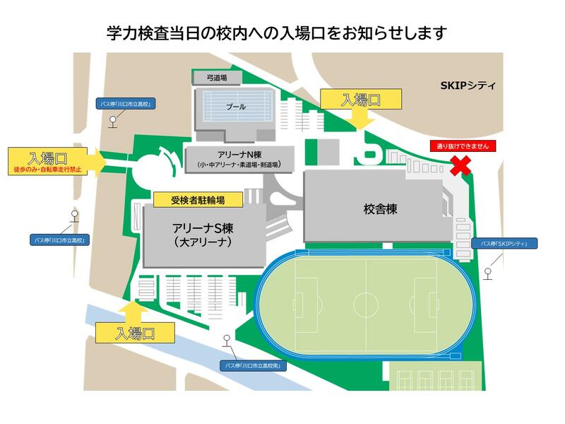 学力検査および面接等で来校する際には、安全に気を付けて下図の入り口から入校してください。事故防止のため校内は自転車走行禁止となっていますので、ご協力ください。PDFはこちらから →学力検査当日の入場口案内図.pdf